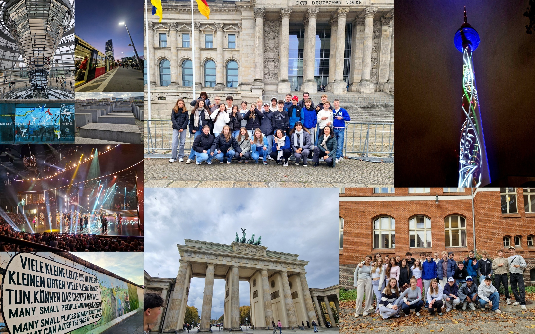 Der Mittwoch stand ganz im Zeichen der Geschichte. Wir besuchten mehrere Gedenkstätten, darunter den Tränenpalast, der früher die Grenze zwischen Ost und West markierte und wo viele Menschen Abschied von ihren Familien nehmen mussten. Am Checkpoint Charlie, einem der bekanntesten ehemaligen Grenzübergänge, spürte man förmlich den Geist der geteilten Stadt. Auch das Holocaust-Mahnmal mit seinen unzähligen grauen Stelen hinterließ einen bleibenden Eindruck - ein stiller, nachdenklicher Moment inmitten der Großstadt. Nach einer Besichtigung der Kaiser-Wilhelm-Gedächtniskirche hatten wir am Nachmittag noch Zeit, Berlin auf eigene Faust zu erkunden. Spätestens jetzt wurden Berliner Currywurst und Döner probiert:-) Nach dem Abendessen ließen wir uns beim "Festival of Lights" verzaubern - die bunt angestrahlten Gebäude und Kunstprojektionen tauchten die Stadt in ein ganz besonderes Licht.Am Donnerstag besichtigten wir die Gedenkstätte Hohenschönhausen, ein ehemaliges Stasi-Gefängnis. Ein Zeitzeuge führte uns durch die engen Gänge und berichtete eindrücklich von seiner Haftzeit - Gänsehaut pur. Danach ging es noch einmal zur Berliner Mauer, wo wir erfuhren, mit welchen kreativen und mutigen Ideen Menschen versuchten, die Grenze zu überwinden.
