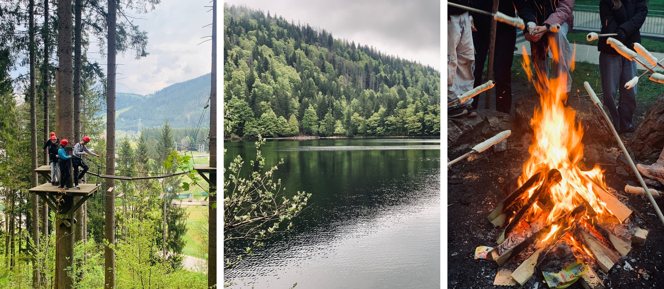 Montag, 5. Mai 2025: Wir haben uns in Kirchzarten getroffen und von dort aus eine gute Verbindung zur Jugendherberge „Hebelhof“ genommen. Als wir dort angekommen sind, wurden wir herzlich willkommen geheißen und durften unser Gepäck in unseren eigenen Raum bringen. Danach sind wir zum „Haus der Natur“ gefahren und haben dort eine sehr interessante Führung bekommen. Um 16 Uhr durften wir die Zimmer beziehen, die wirklich sehr schön waren. Wir haben in unserem Gemeinschaftsraum viel Zeit verbracht und zusammen Spiele gespielt.Dienstag, 6. Mai: Beim Frühstück gab es die Möglichkeit, sich Lunchpakete zu machen, da man mittags meistens unterwegs war. Da es an diesem Tag neblig und regnerisch war, sind wir in die „Fundorena“ gegangen, anstatt das geplante Programm im „Haus der Natur“ zu machen. Als Plan B für die Schlechtwetterlage war das ein toller Ersatz, und wir würden es jedem weiterempfehlen! Anschließend sind wir zum Feldsee gewandert und haben ihn einmal umrundet – das hat sich wirklich gelohnt, da er sehr schön ist! Am Abend hatten wir die Möglichkeit, eine kleine Disco zu veranstalten. Dafür gab es ein altes Schwimmbad, dessen Boden höher gelegt war und sich super als Tanzfläche eignete.