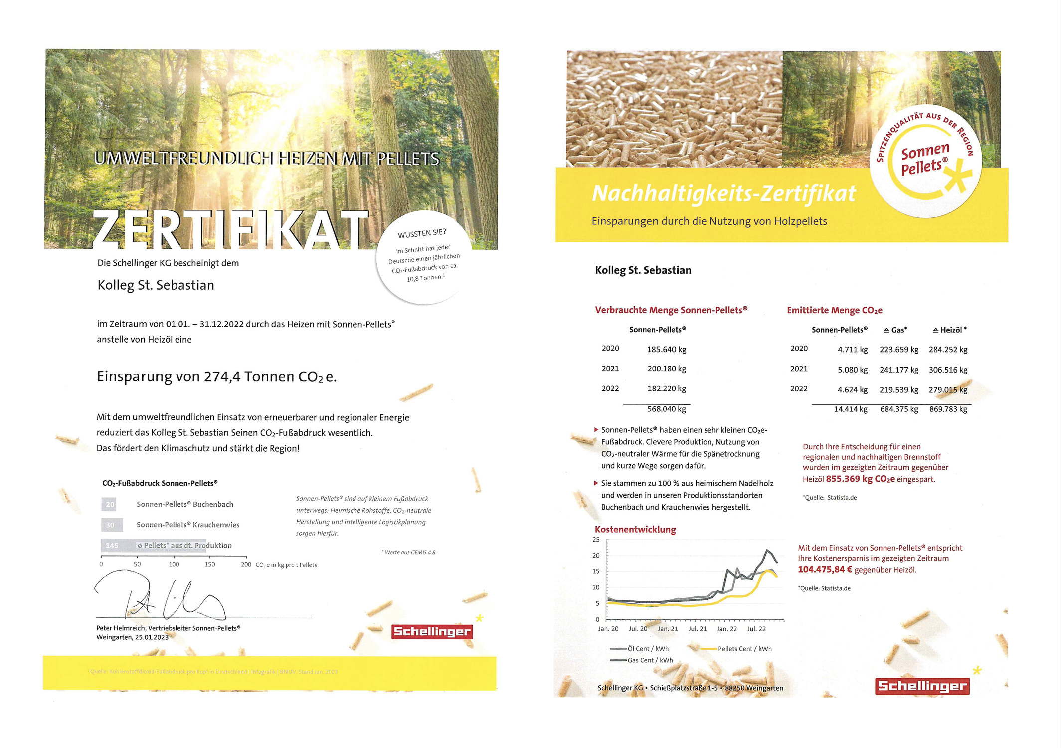 Es ist gelungen, alle Nutzer der Gebäude auf dem Areal des Kollegs St. Sebastian von einem Nahwärmeprojekt zur Versorgung mit Heizung und Warmwasser zu überzeugen. Statt wie zuvor mit fünf Ölbrennern mit über einem Megawatt Leistung wird die Wärme nun über einen 250 kW Pelletkessel in Kombination mit einer 80 m² Solarthermieanlage erzeugt. Beide speisen einen großvolumigen Pufferspeicher und kommen dadurch mit einer wesentlich geringeren Nennleistung aus. Der Pufferspeicher ist in einem der ehemaligen Heizöltankräume untergebracht. Noch lange verwertbare Technik wurde nachhaltig weiterverwendet. Das gesamte Steuerungssystem wird per Fernwartung von der Fa. EWS aus Schönau überwacht.