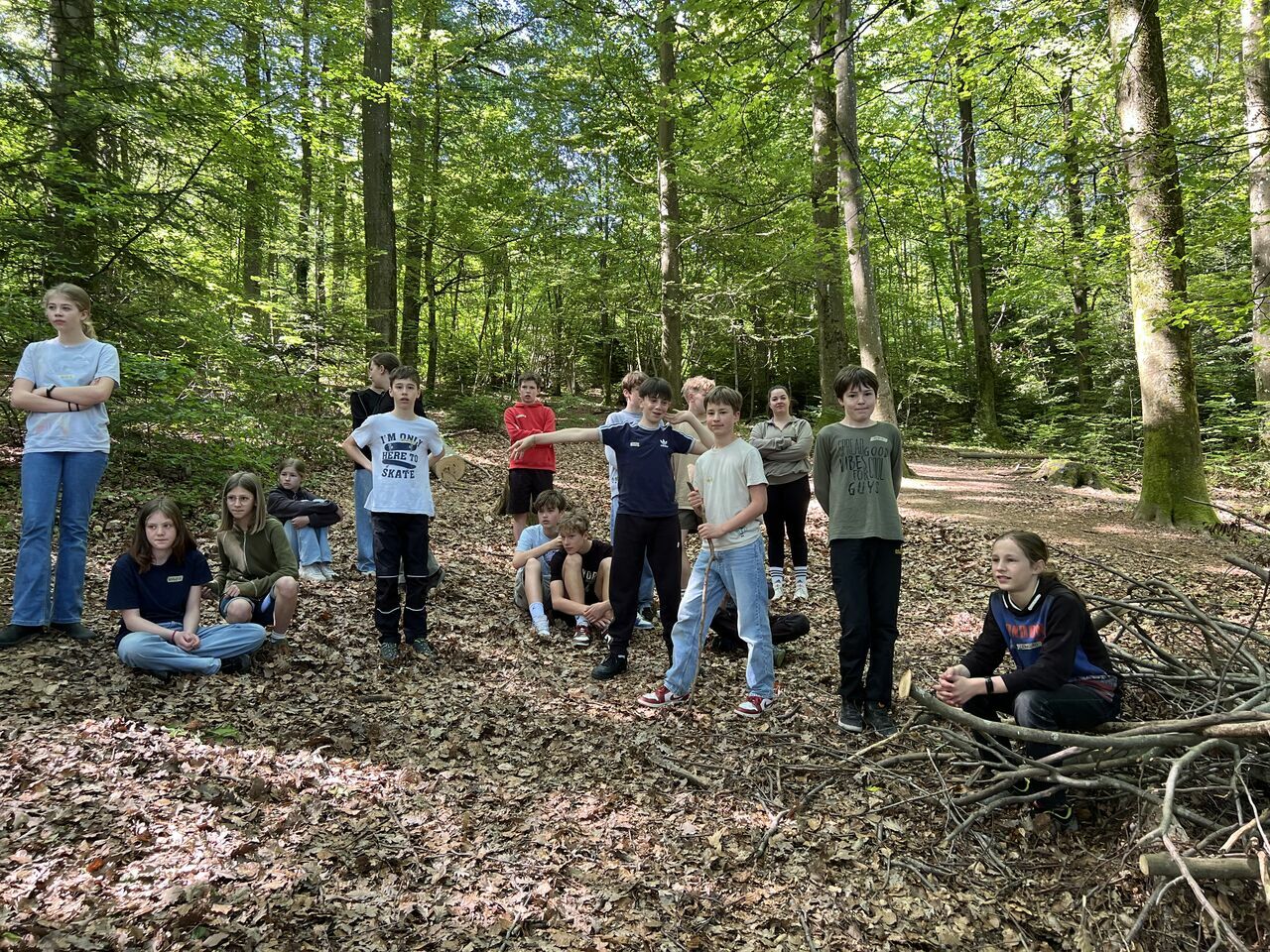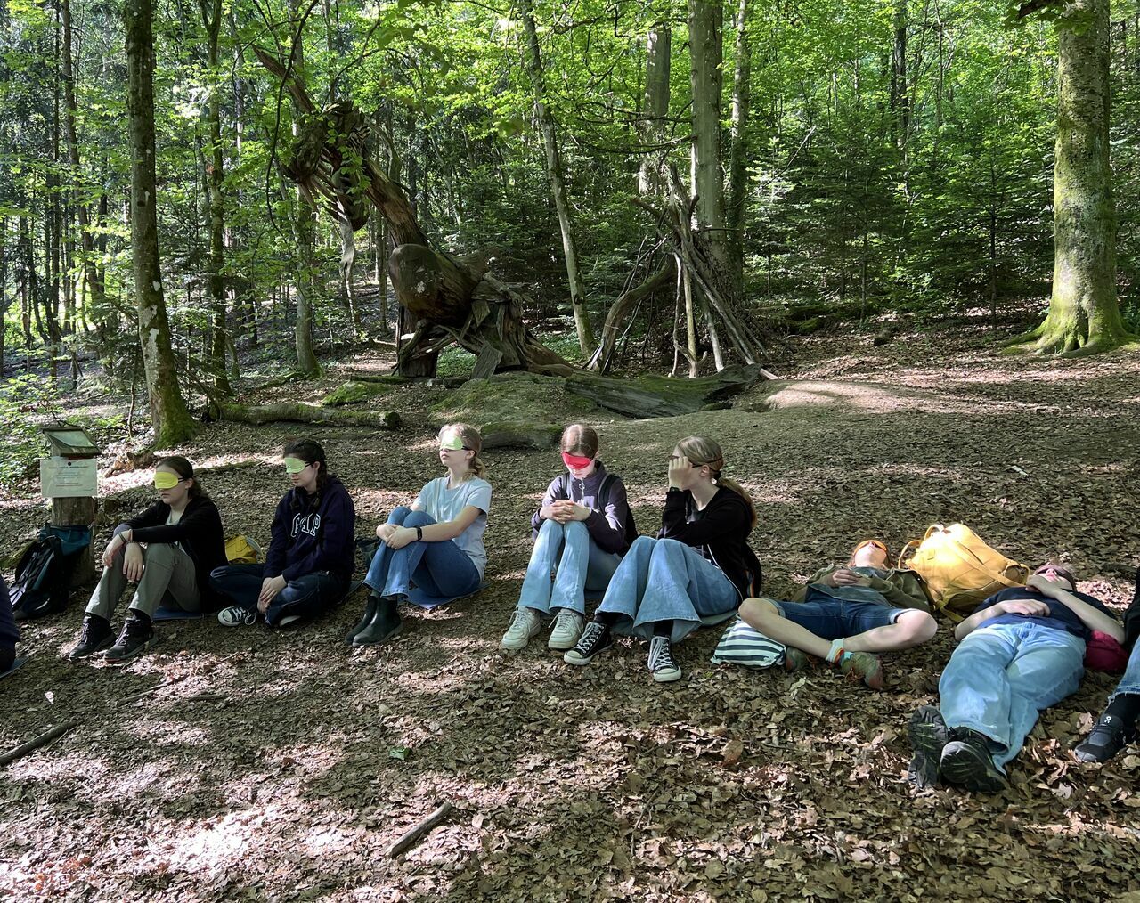 Am Dienstag, 14. Mai 2024, trafen wir uns morgens am Bahnhof Kirchzarten, um mit Zug und Straßenbahn zum WaldHaus Freiburg zu fahren. Nachdem wir dort angekommen waren, war erst einmal Zeit für eine kurze Vesperpause. Dann ging es auch schon in den Wald.Am Anfang haben wir uns mit Augenbinden auf den Waldboden gesetzt und den Wald-Geräuschen (Vogelgezwitscher, Blätterrascheln, ...) zugehört, danach sollten wir verschiedene Gegenstände aus dem Wald (Zapfen, Eicheln, Rinde) erfühlen. Anschließend durften wir barfuß durch den Wald laufen. Dann sollte sich jeder einen Ort im Wald suchen, um sich dort für 10 Minuten zu entspannen.