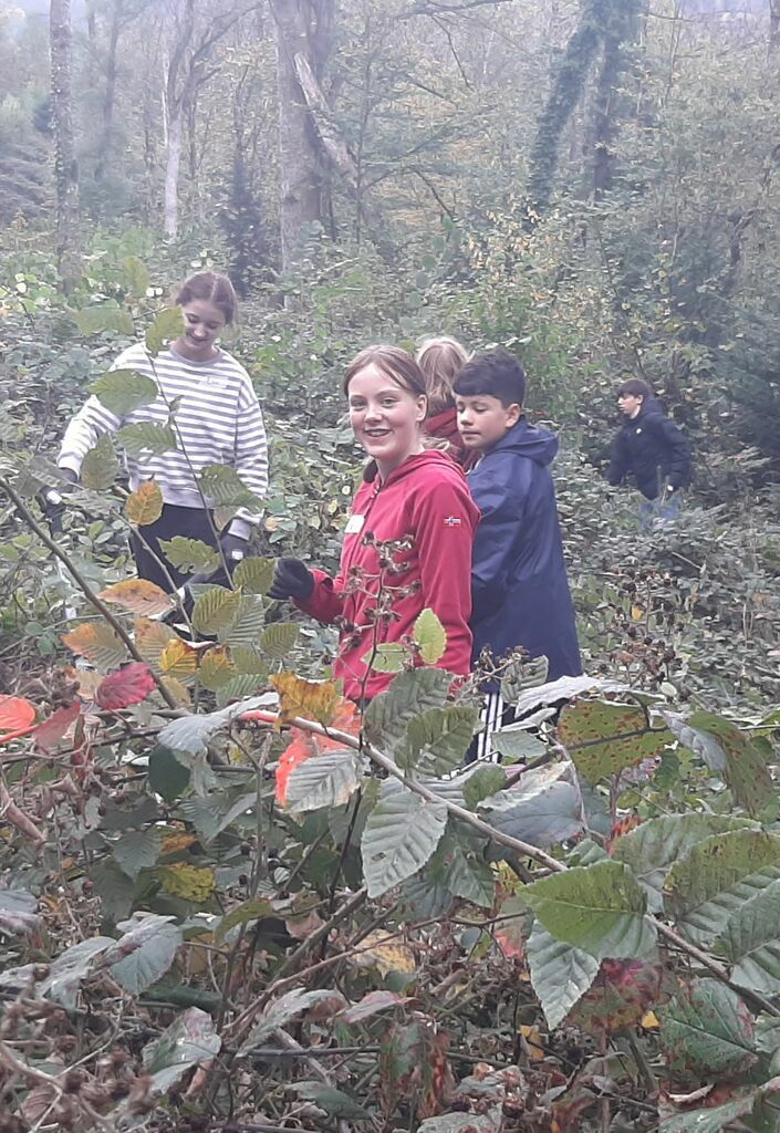 Im Anschluss ging es ans Arbeiten: Wir erhielten Macheten und Scheren und machten uns daran, die jungen Eichen von den überwuchernden Buchen, Haselnussbüschen und Brombeeren freizuschneiden, die im letzten Jahr gepflanzt worden waren. Zum Abschluss des Waldtages tranken die Förster mit der Klasse noch einen Tee am Feuer, wir unterhielten uns angeregt und die Förster dankten uns für unseren Einsatz. Gegen 12:20 Uhr endete der ereignisreiche Vormittag im Wald und wir kehrten zufrieden mit dem Ergebnis nach Hause zurück.Auch die Klassen 8c und 8d führen einen solchen Einsatz als Beitrag zur Nachhaltigkeit im November durch.