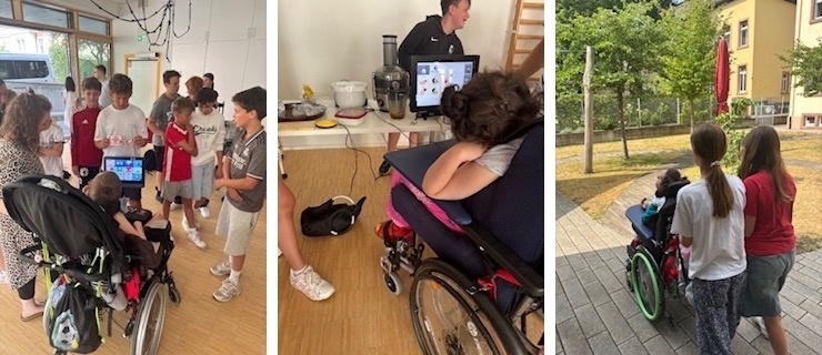 Wir, die 7d, haben unser Sozialprojekt in der Janusz-Korczak-Schule in Freiburg durchgeführt.Die Kinder und Jugendlichen mit Einschränkungen hatten das Vergnügen, unsere selbst gemachten Smoothies zu probieren. Es gab zwei verschiedene Sorten: "Mango-Dream" und "Berry-Dream". Jeder von uns brachte etwas mit: Erdbeeren, Himbeeren, Bananen, Mangos, Karotten. Es kamen fast alle Schülerinnen und Schüler der Korczak-Schule zum Probieren und manche konnten mit etwas Hilfe sogar den Mixer bedienen. Wir waren alle sehr erstaunt über die Technik der Kommunikation mit uns!