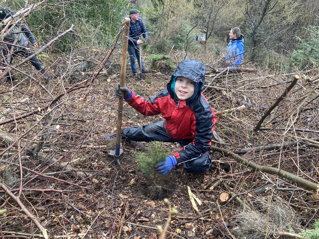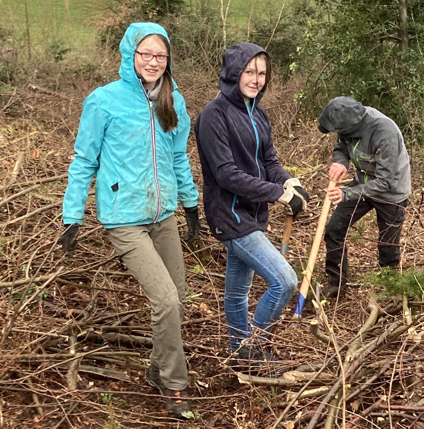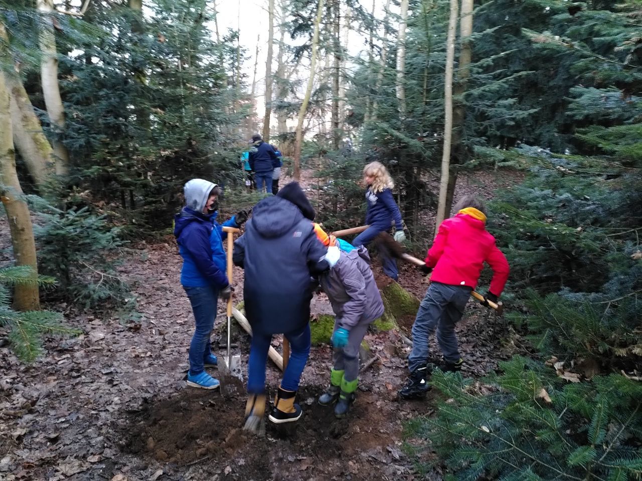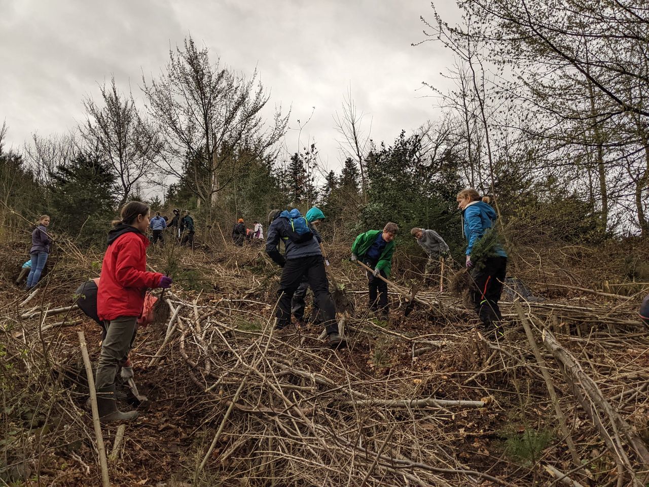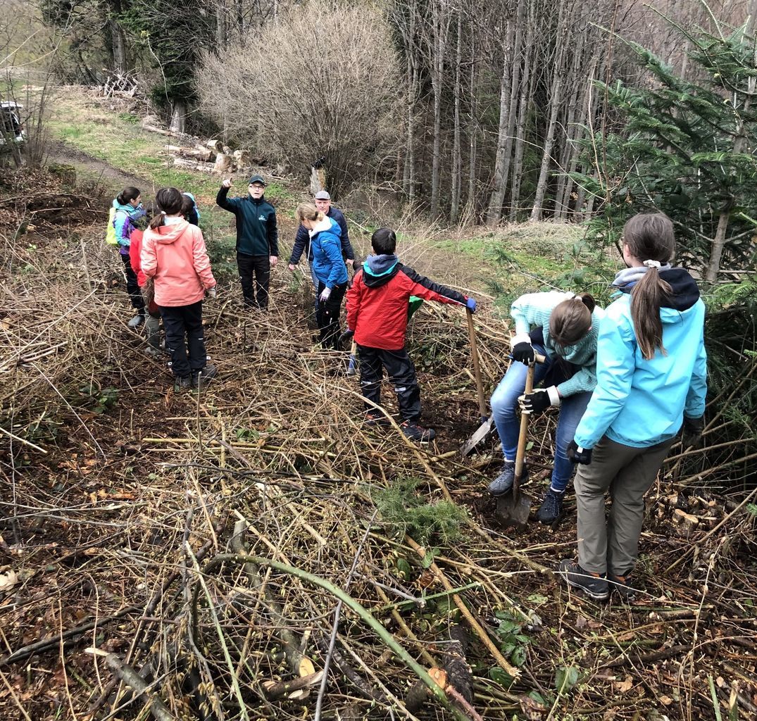 Um 8.40 Uhr trafen wir uns an der Buswendeschleife am Kolleg. Zwei Eltern und Frau Aßmann brachten uns nach Burg Höfen an die Tarodunumschule, an der das Projekt startete. Der Revierförster, die Projektleiterin und der Waldbesitzer empfingen uns freundlich. Danach brachen wir auf und wanderten zusammen einen Waldweg hoch. Bevor es mit der Arbeit losging, erklärte uns der Förster noch etwas über den Klimawandel und die Bedeutung des Waldes für das Klima. Dann lernten wir, wie man einen Baumsetzling richtig in den Boden setzt. Wenig später konnte es mit dem Pflanzen losgehen. Wir hatten Douglasien, Spitzahorn und Kirschen zu pflanzen. Diese Bäume sind gut an die sich ändernden Klimabedingungen angepasst. Wir arbeiteten mit Hacken und Spaten, um das feste Wurzelwerk des früheren Bewuchses zu durchbrechen. Insgesamt haben wir mit einer Klasse von einer anderen Schule um die 200 Bäume gepflanzt. Am Ende waren wir sehr stolz auf unsere Leistung und machten uns wohlgemut auf zum warmen Mittagessen im Tal. Es gab Chili con Carne und Kartoffelsuppe und Apfelschorle oder Wasser. Dies alles spendierte uns der Waldbesitzer, um sich bei uns für unsere Unterstützung zu bedanken. Das gemeinsame Essen war ein schöner Abschluss unseres Projektes. Bevor wir wieder zur Schule zurückkehrten, erhielt jeder von uns zur Belohnung noch eine Gummibärchenschlange.Wir hoffen, dass die von uns gepflanzten Bäume gut gedeihen!