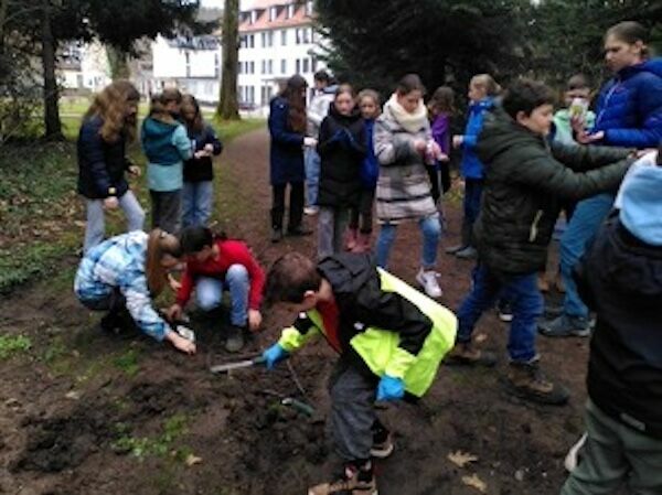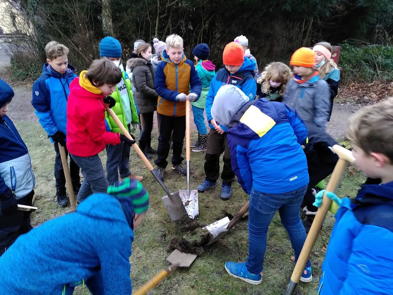 Bei eisigen 0 Grad rückten am frühen Montag morgen vor Weihnachten 26 Schülerinnen und Schüler der Klasse 5a mit den Lehrern Herrn Jöchle und Herrn Fleig in den Park unserer Schule aus - ausgerüstet mit Gummistiefeln, Spaten, Pfosten, Säcken voll Erde, viel Motivation und 15 Baumsetzlingen der Flatterulme. Diese mussten vor Weihnachten noch in die Erde!Als Naturparkschule beteiligt sich das Kolleg St. Sebastian an einer Pflanzaktion der Flatterulme.