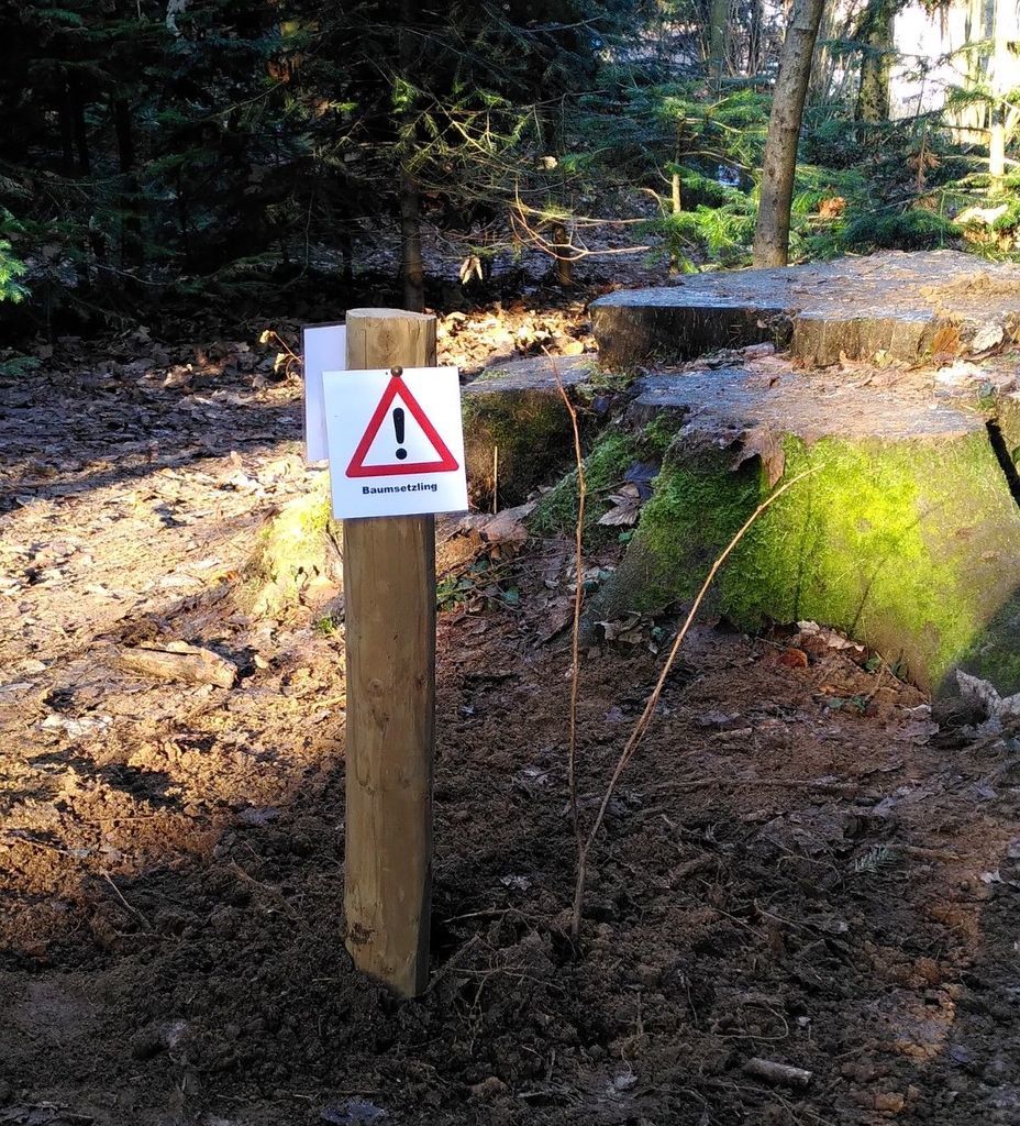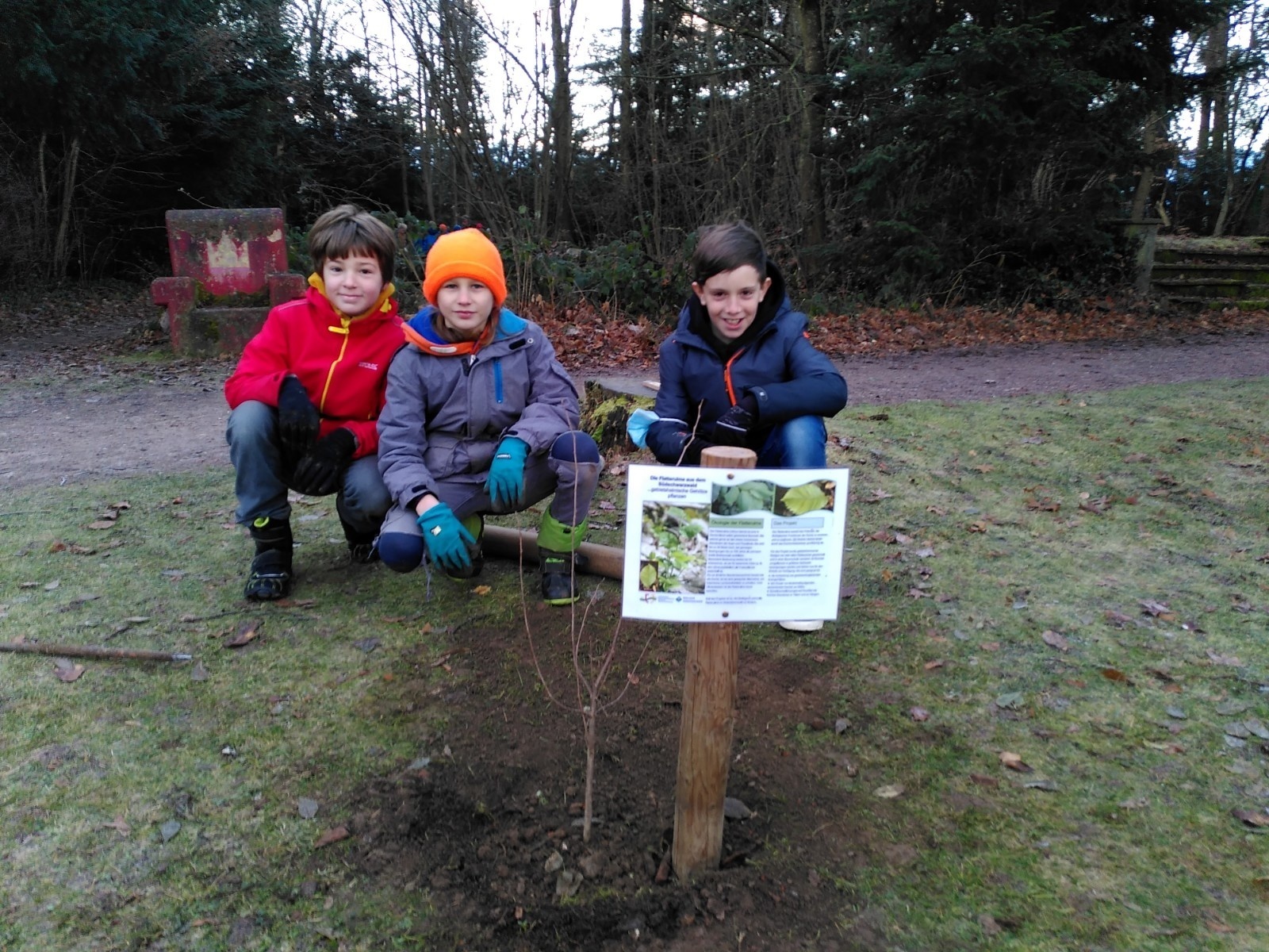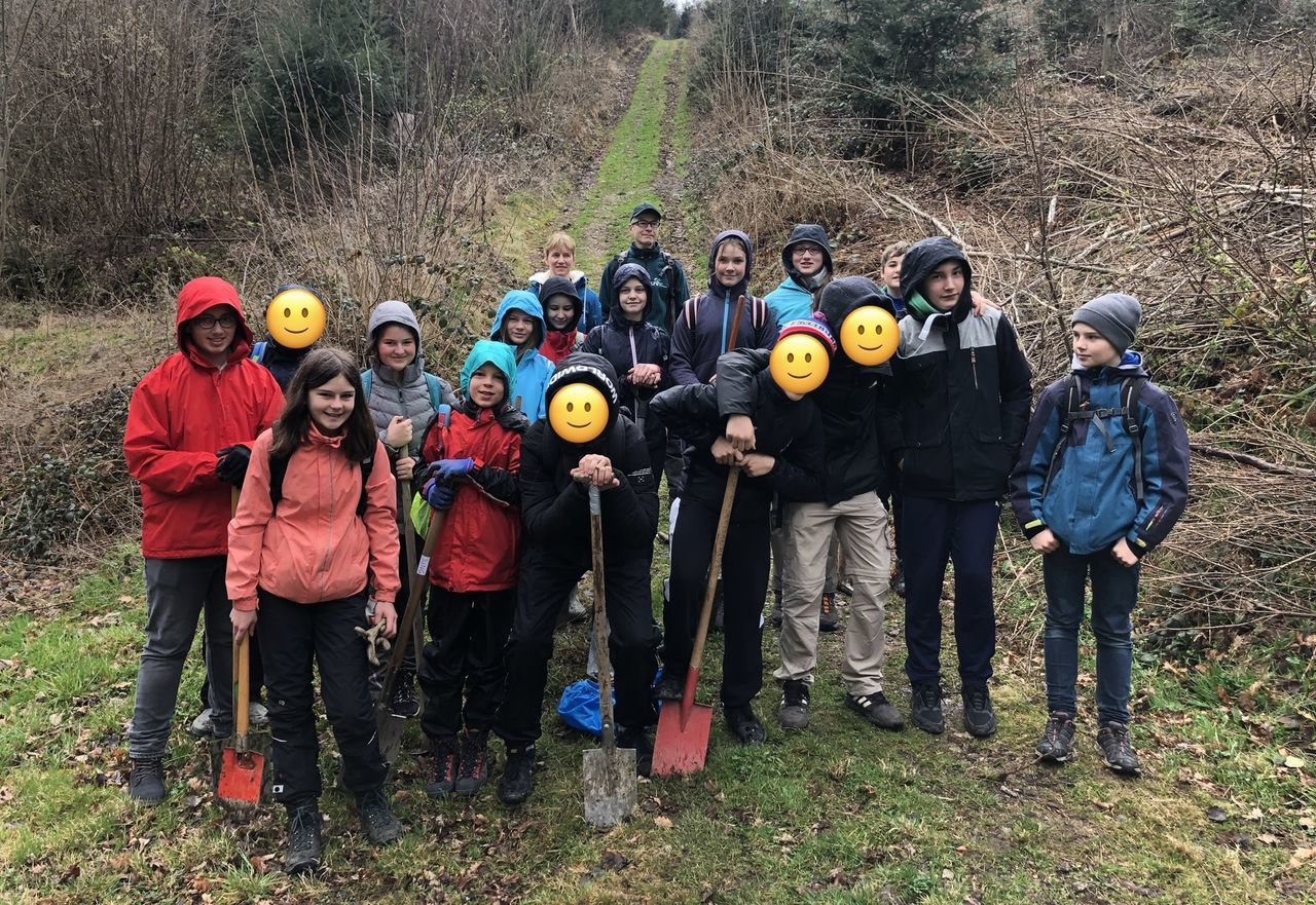 Und die Klasse 5a hilft tatkräftig mit! Die Setzlinge wurden nicht nur gepflanzt, sondern auch mit Hinweis- und Informationsschildern gekennzeichnet. Nun müssen die Setzlinge nur noch groß werden!
