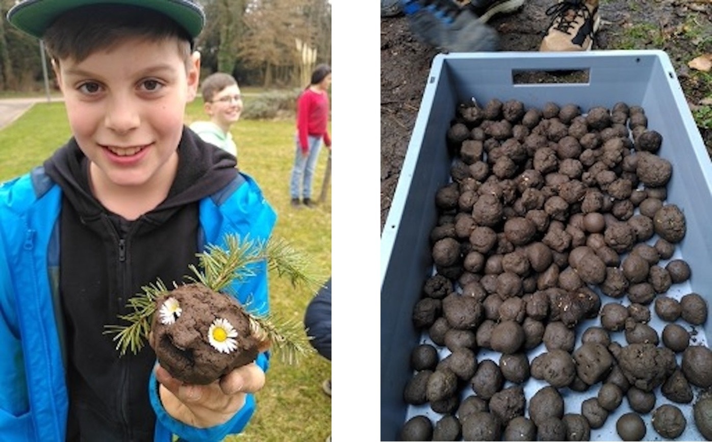 Damit unsere beiden Blumenwiesen auch in diesem Jahr wieder blühen, haben mehrere Klassen in den letzten Wochen mit Saatkugeln nachgeholfen. Dabei wurden Erde und Samen zu kleinen Kugeln geformt. Dadurch können die Samen besser keimen und die Pflanzen leichter heranwachsen. Durch die vielen helfenden Hände sind in schneller Zeit einige hundert Saatkugeln entstanden und gleich auf der Wiese verteilt worden.Vielen Dank an alle fleißigen Hände!