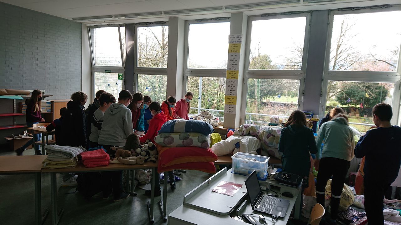 In Solidarität mit den Menschen, die gerade in der Ukraine oder auf der Flucht vor dem Krieg sind, haben wir als ganze Schulgemeinschaft eine Woche lang - vom 14.3. bis zum 18.3. - gemeinsam Sachspenden gesammelt, darunter Lebensmittel, Hygiene-Artikel und Schlafsäcke.Dabei kamen über 60 volle Kartons zusammen!