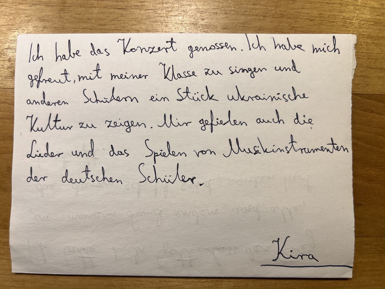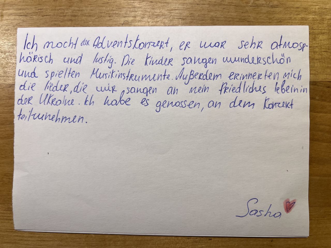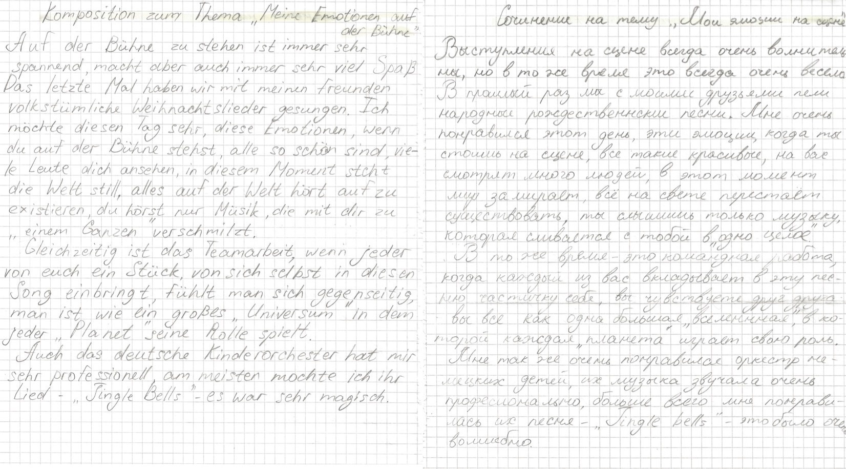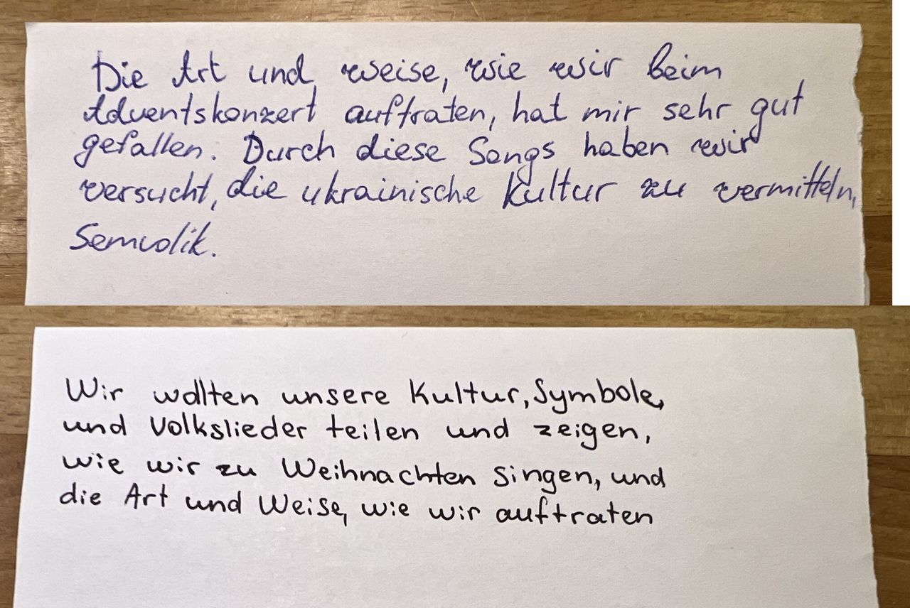 Eingerahmt zwischen Big Band, Orchester, Unter-, Mittel- und Oberstufen-Chören erlebte auch der frisch formierte Chor unserer ukrainischen SchülerInnen beim Adventskonzert seinen ersten Auftritt. Überwiegt im Alltag nicht selten die Frage "Wer sind wir?", so entstand unter der Leitung von Olga Kuzub aus Odessa ein Gemeinschaftsgefühl: Ja, wir sind wer. Wir können etwas. Geben. Zurückgeben.