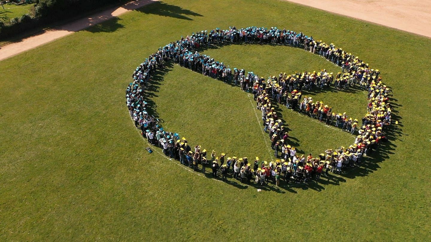 Nachdem wir vergangene Woche bereits über 60 Kisten voll mit Sachspenden für die Ukraine gesammelt haben, kamen wir am Dienstag, 22.03.2022, noch einmal als ganze Schulgemeinschaft zusammen, um ein Zeichen für den Frieden zu setzen. In Form des Peace-Zeichens und in den Farben der Ukraine haben wir uns auf dem Sportplatz aufgestellt, in Zusammenarbeit mit dem SWR Luftaufnahmen gemacht und uns so deutlich mit der leidenden ukrainischen Zivilbevölkerung solidarisiert.Hier geht es zum Beitrag des SWR.