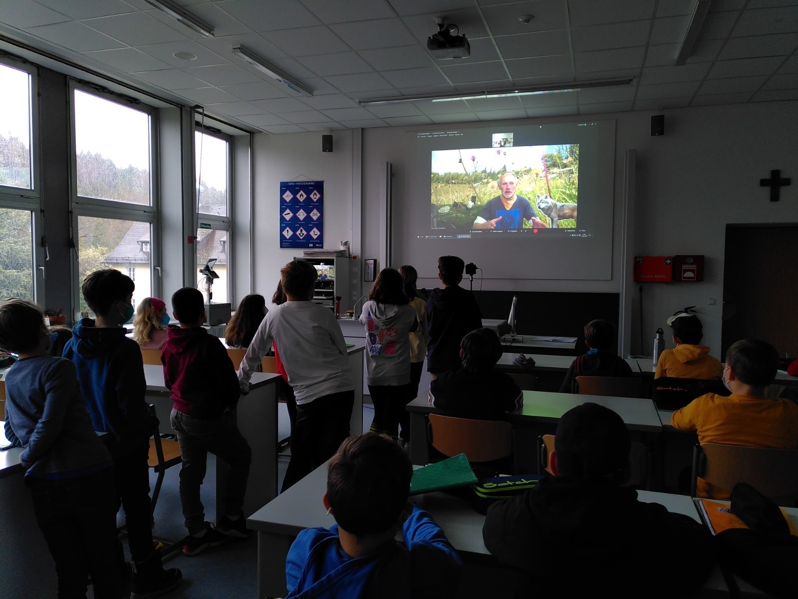 Mit dem aufwändig ausgebauten Studio des Wildtierexperten Peter Sürth kamen Wolf und Luchs sogar in den Biologieraum der Schule. Herr Sürth wurde online zugeschaltet und stellte sich den unzähligen Fragen der Schülerinnen und Schüler zu beiden Tierarten. Außerdem zeigte er viele spannende, teilweise selbstgedrehte Videos zum Hauptthema Wolf.